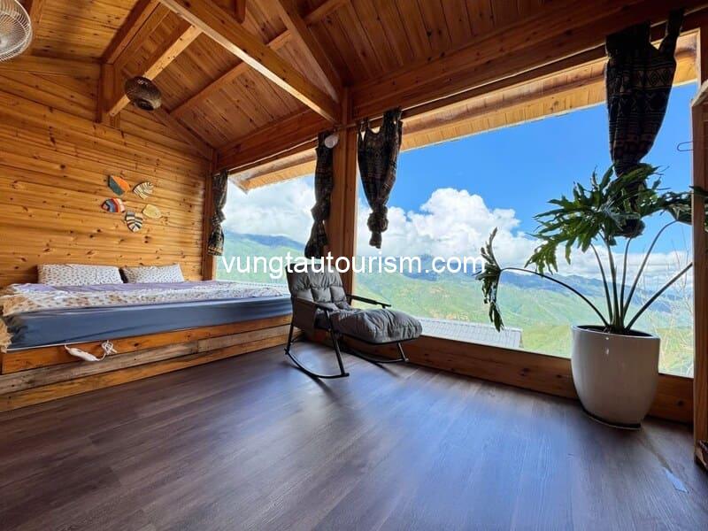 Căn phòng có view hướng núi cực đẹp và bay bổng với không gian siêu rộng rãi. Nội thất khép kín với vật liệu bằng gỗ, cửa kính lớn để nhìn ra ngoài, 2 giường đôi cỡ lớn với sức chứa tiêu chuẩn dành cho 4 người.