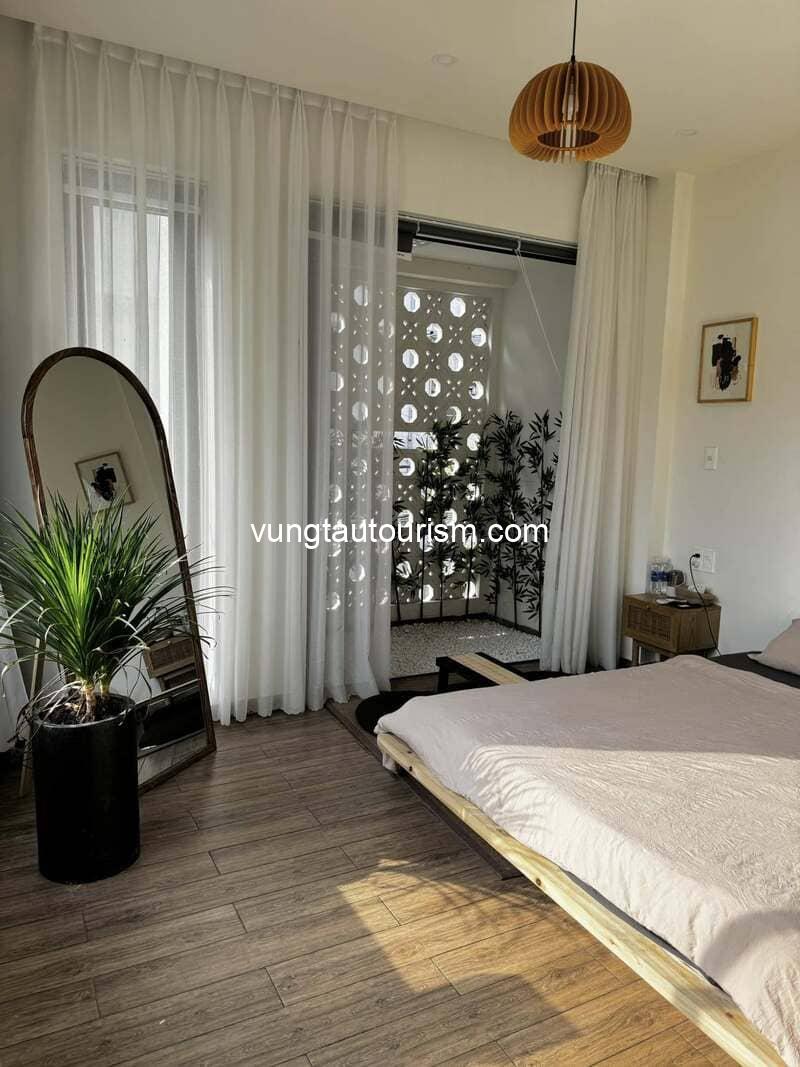 Khu vực phòng ngủ được bố trí với giường ngủ chất lượng cao, chăn ga gối nệm được thay mới sau mỗi lượt khách và giặt sấy bằng máy chuyên dụng để đảm bảo độ sạch sẽ và thơm tho. Hệ thống ánh sáng được thiết kế đa tầng với đèn chính, đèn đọc sách và đèn trang trí, tạo ra nhiều không gian ánh sáng khác nhau phù hợp với từng hoạt động.