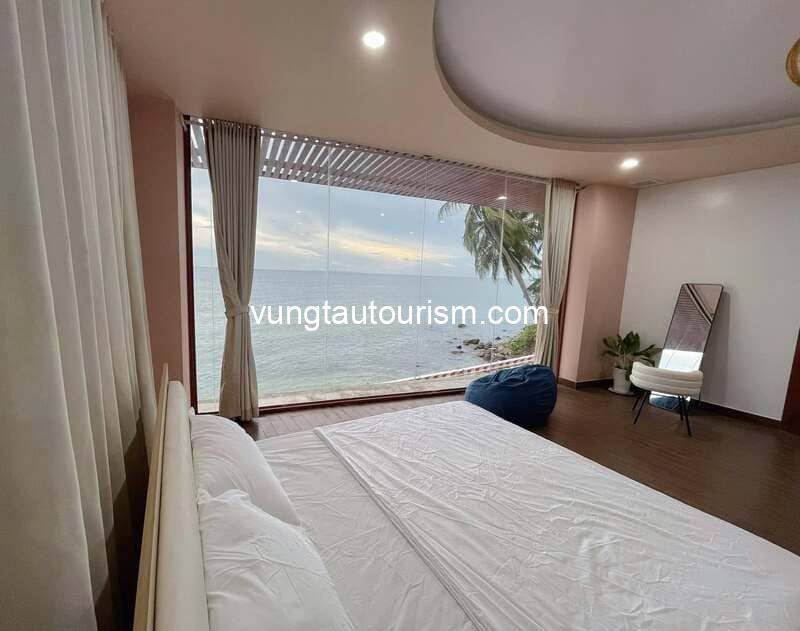 Đặc biệt ấn tượng nhất là hệ thống phòng 4 người thuộc loại bungalow 2 tầng với ban công chung rộng rãi. Từ ban công này, du khách có thể ngắm nhìn toàn cảnh núi non hùng vĩ và vịnh biển xanh thẳm. Không gian ban công được trang bị bàn ghế gỗ, đèn trang trí và cây xanh, tạo thành khu vực sinh hoạt chung lý tưởng cho các nhóm bạn hoặc gia đình lớn muốn có những giây phút gắn kết.